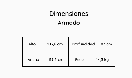 - Dimensiones abierto: 87 cm largo x 59,5 ancho x 103,6 alto