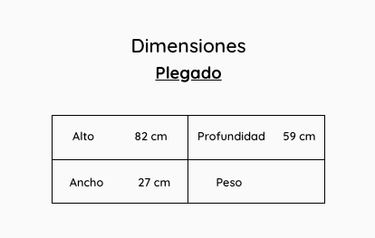 - Dimensiones plegado: 59 cm largo x 27 ancho x 82 alto