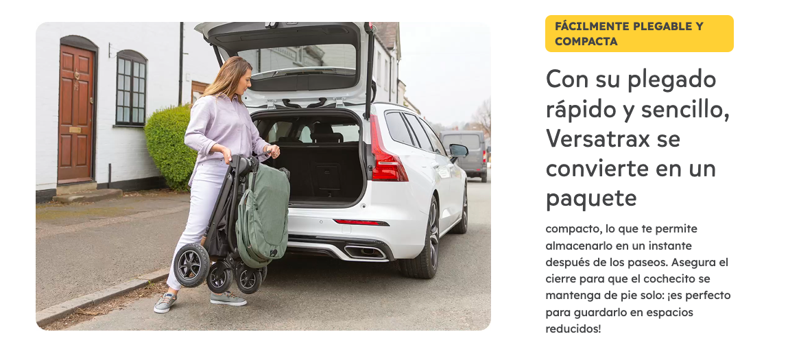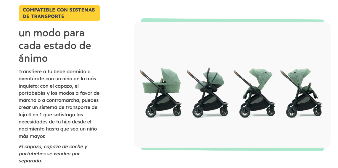 - Cuatro modos en un solo cochecito cuando lo combinas con el portabebés o el capazo, para que puedas pasear con el bebé desde el primer día y cambiar del coche al carrito sin desabrocharlo ni despertarlo