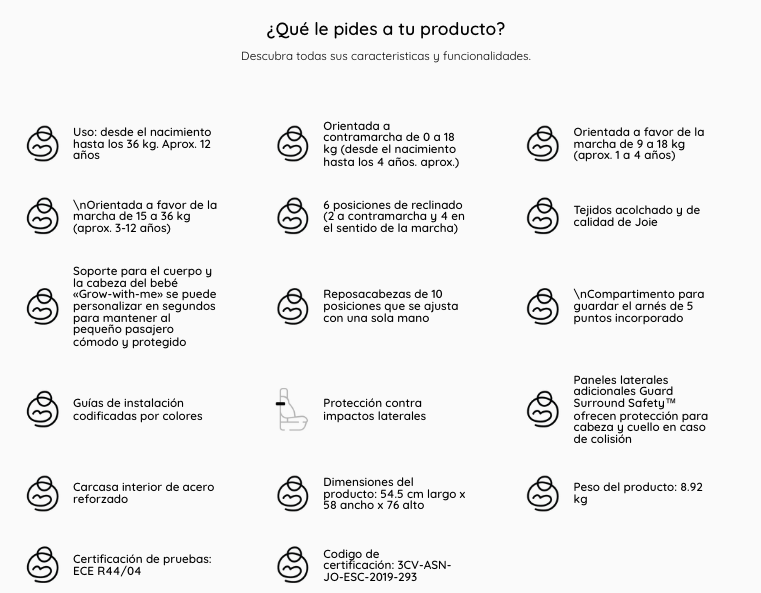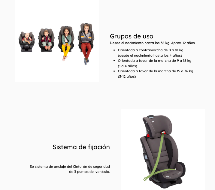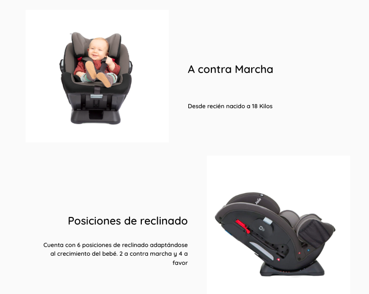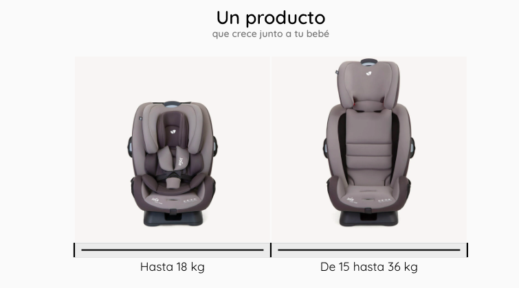 - Un compañero ideal que crece del nacimiento hasta que tu bebé tenga 25 kilos y puede viajar a contramarcha hasta los 18 kilos, es decir aproximadamente hasta los 7 años. Silla para los grupos 0+/1/2. Cuenta con 4 posiciones de reclinado, 1 a contramarcha y 3 a favor de la marcha. La protección lateral proporciona más seguridad para la cabeza, cuerpo y caderas.