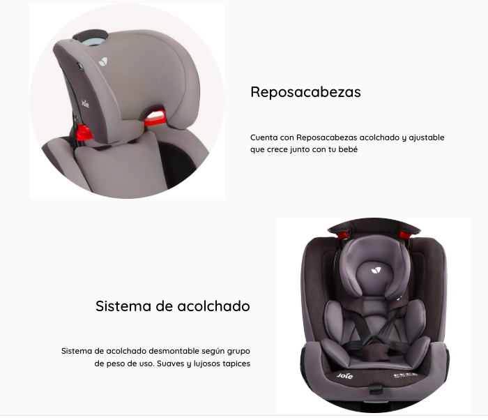 - Cuenta con arnés de 5 puntos con protectores de hombros y hebilla.
