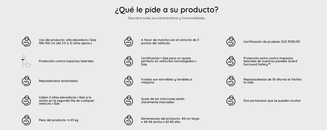 - Esta silla elevadora i-Size compacta reúne todas las funciones y las normas de seguridad más exigentes en una estructura elegante y aerodinámica.