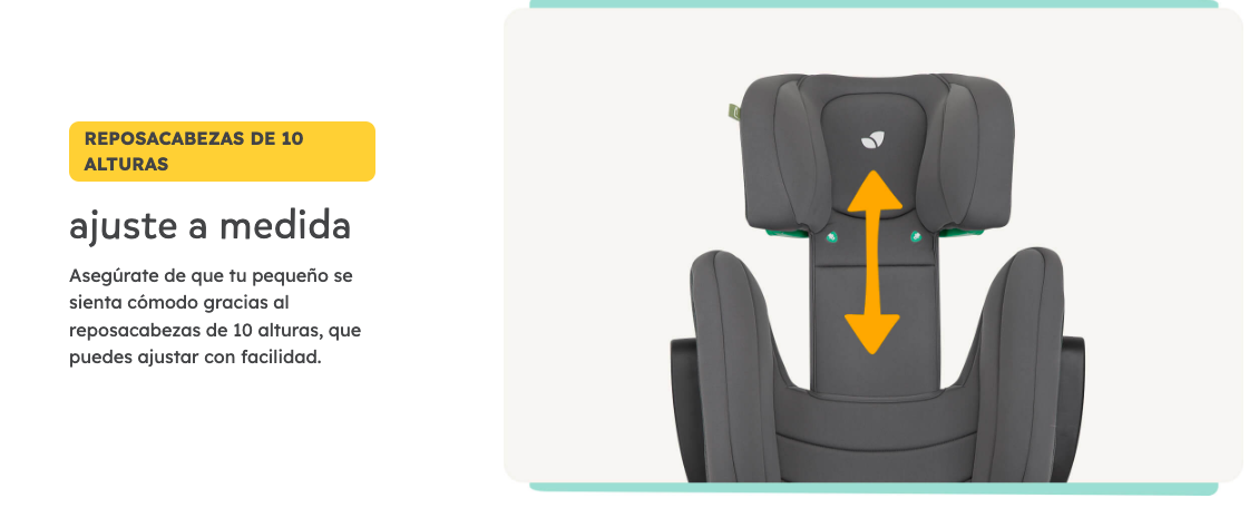 - El reposacabezas de 10 alturas te facilita la vida, ya que se ajusta fácilmente con una sola mano... incluso con la silla ya instalada en el coche.