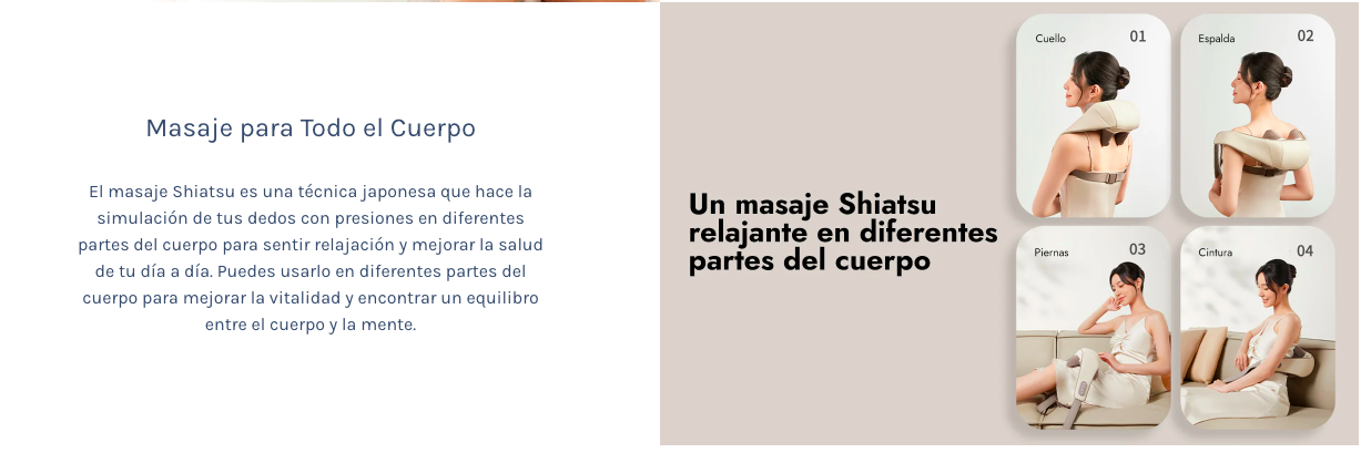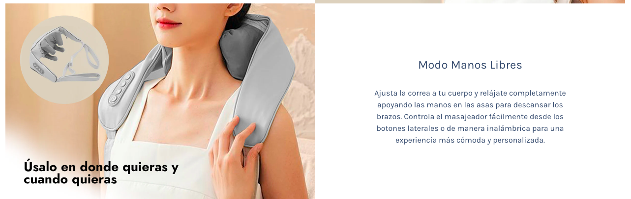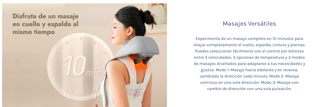 El Masajeador Shiatsu de Cuello y Hombros Ozu ha sido diseñado para simular un masajes de manos, perfecto para relajar los dolores y tensiones que puedas presentar en las zonas. El programa inteligente, inspirado en la antigua técnica de fisioterapia conocida como Shiatsu, con los 3 modos de masajes ayudar a relajar los músculos de tus hombros, cuello y espalda. Además puedes ajustar la correa para experimentar masajes en otras partes del cuerpo.