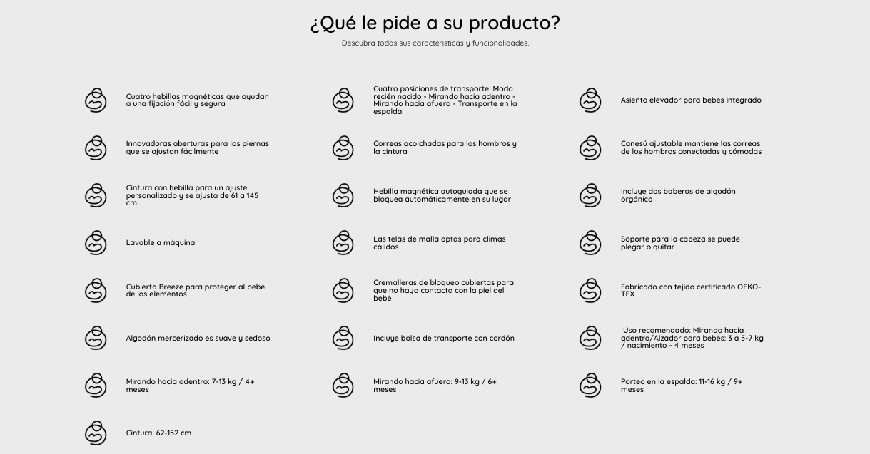 - Cuatro posiciones de transporte proporcionan un posicionamiento ergonómico a medida que su hijo crece, para un desarrollo saludable de la columna y la cadera: modo recién nacido, mirando hacia adentro, mirando hacia afuera, transporte en la espalda.