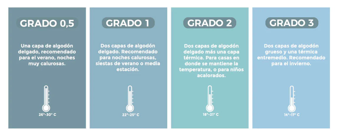 GRADO 2- Dos capas de algodón delgado y una térmica entremedio. Para casas en donde se mantiene la temperatura constante, calefaccionadas o para niños que son acalorados. También recomendado para media estación. + 19°C