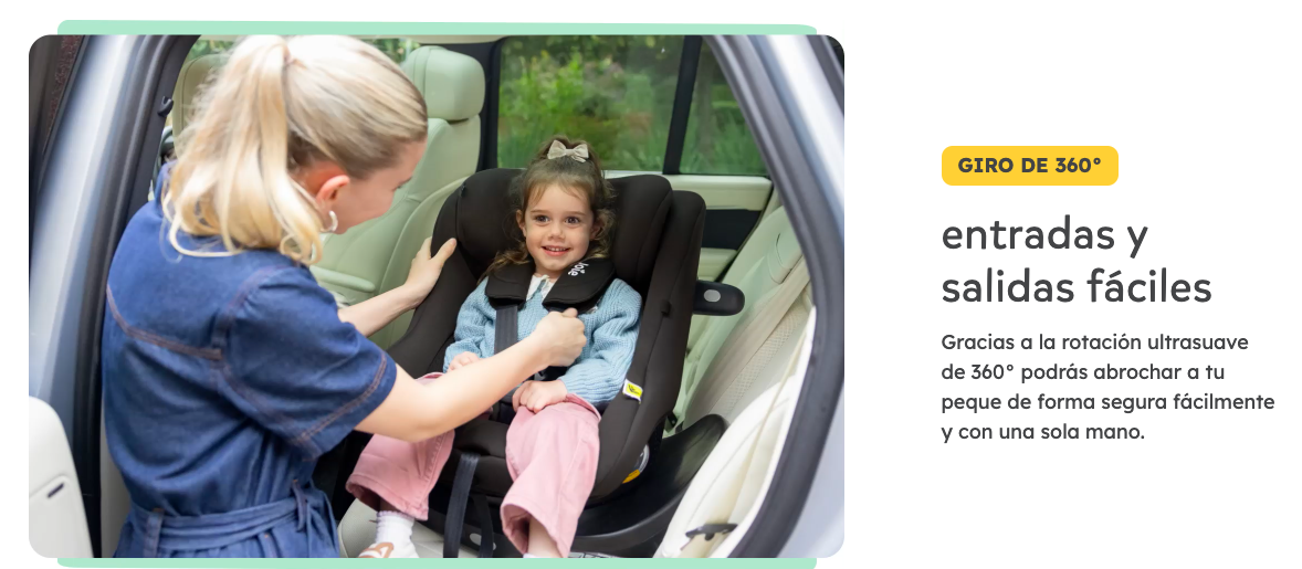 - El asiento giratorio en 360° da la vuelta completa, para que sujetar a tu peque con el arnés sea más sencillo y facilitar la transición de contramarcha a favor de la marcha