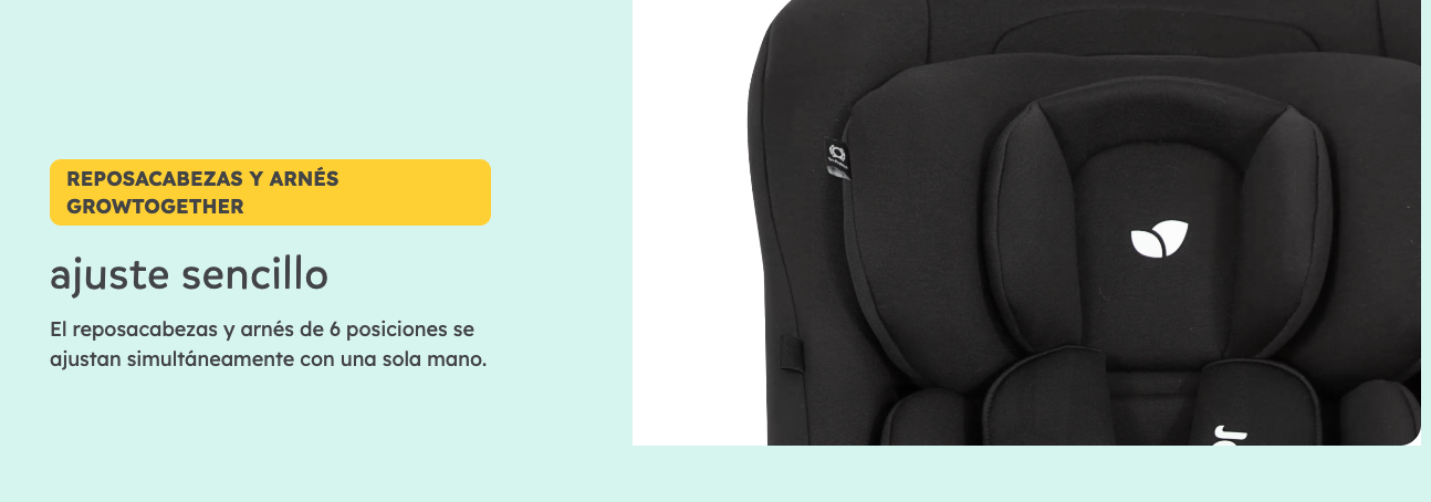 - Gracias al sistema Grow Together™ de 6 posiciones, el arnés y el reposacabezas se ajustan simultáneamente sin necesidad de recolocar el arnés
