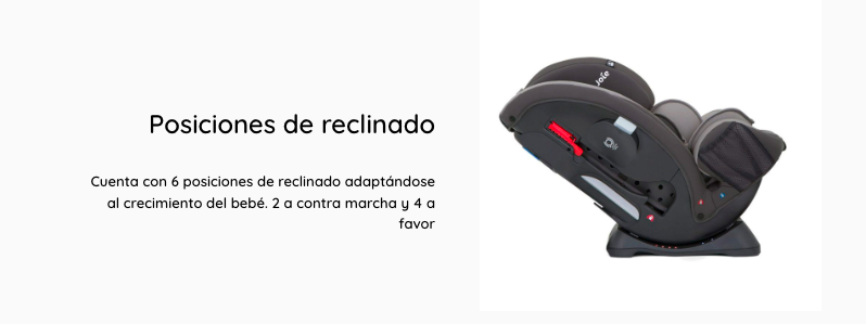 - Cuenta con 4 posiciones de reclinado, 1 a contramarcha y 3 a favor de la marcha.