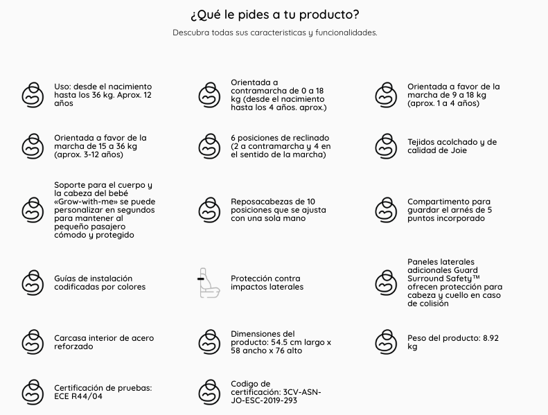 - Un compañero ideal que crece del nacimiento hasta que tu bebé tenga 25 kilos y puede viajar a contramarcha hasta los 18 kilos, es decir aproximadamente hasta los 7 años.