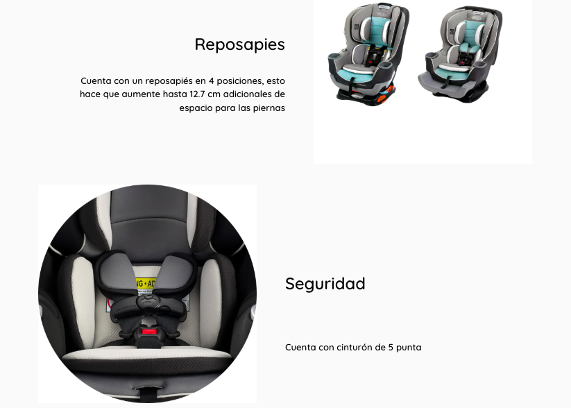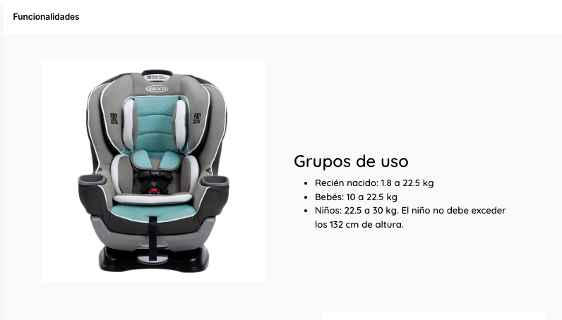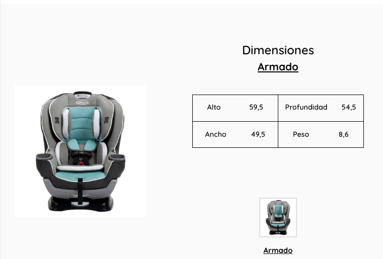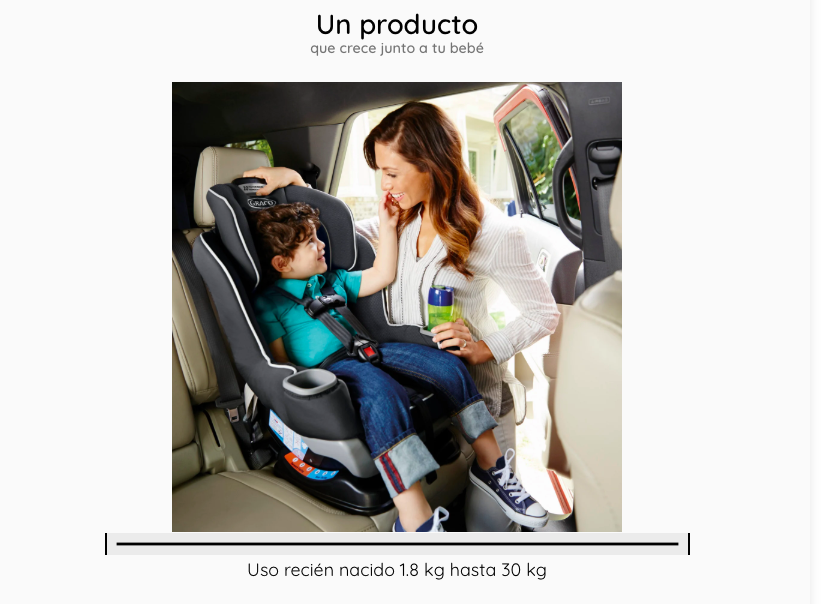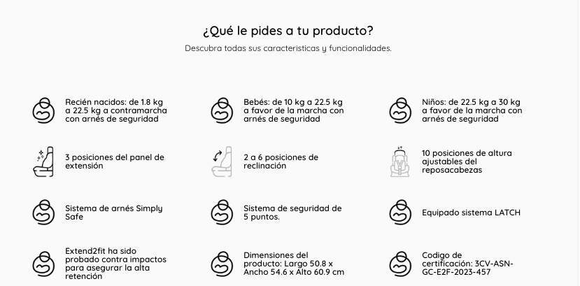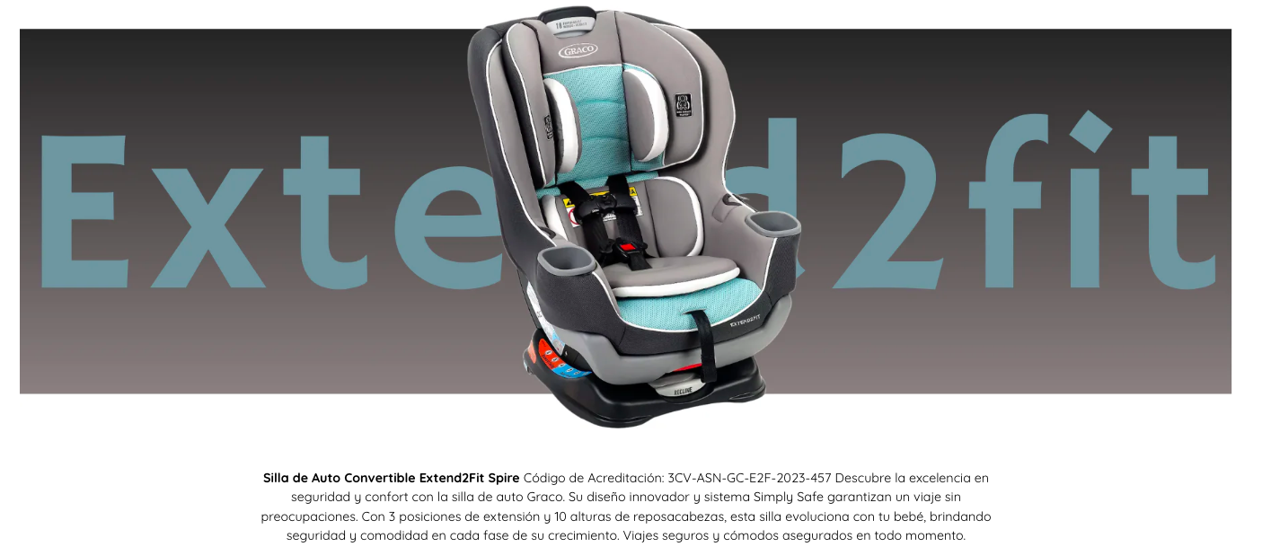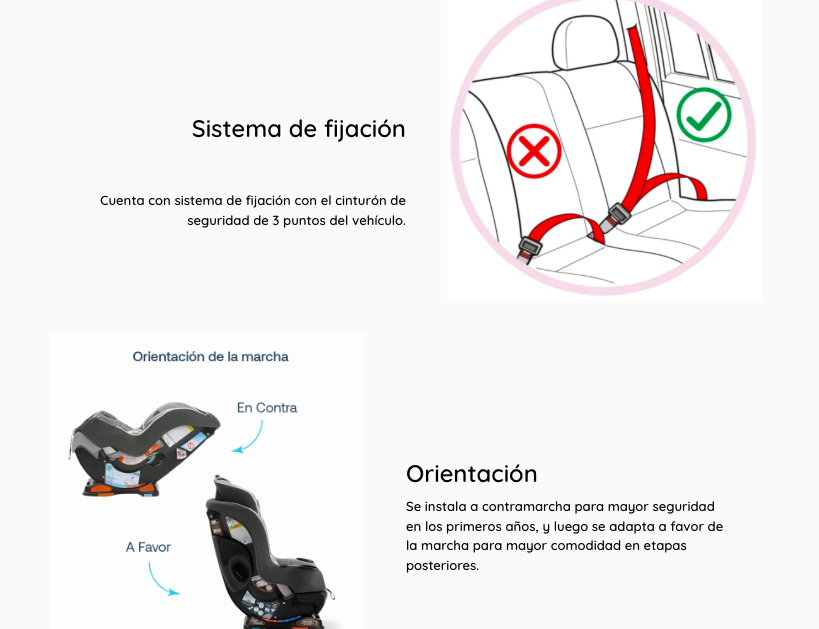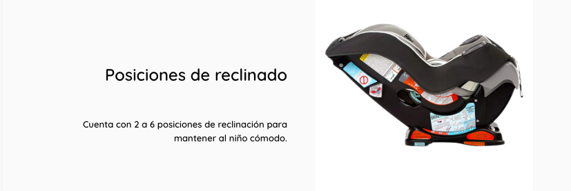 - Cumple o excede los criterios de retención infantil en pruebas de choque frontal según la norma estadounidense FMVSS 213.