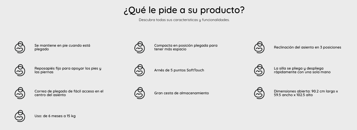 - La reclinación del asiento en 3 posiciones te ayuda a encontrar la inclinación perfecta para tu bebé, de modo que incluso pueda acompañarte a la mesa mientras comes