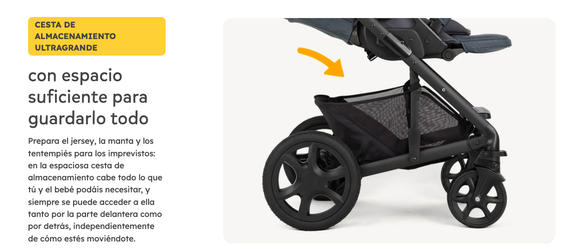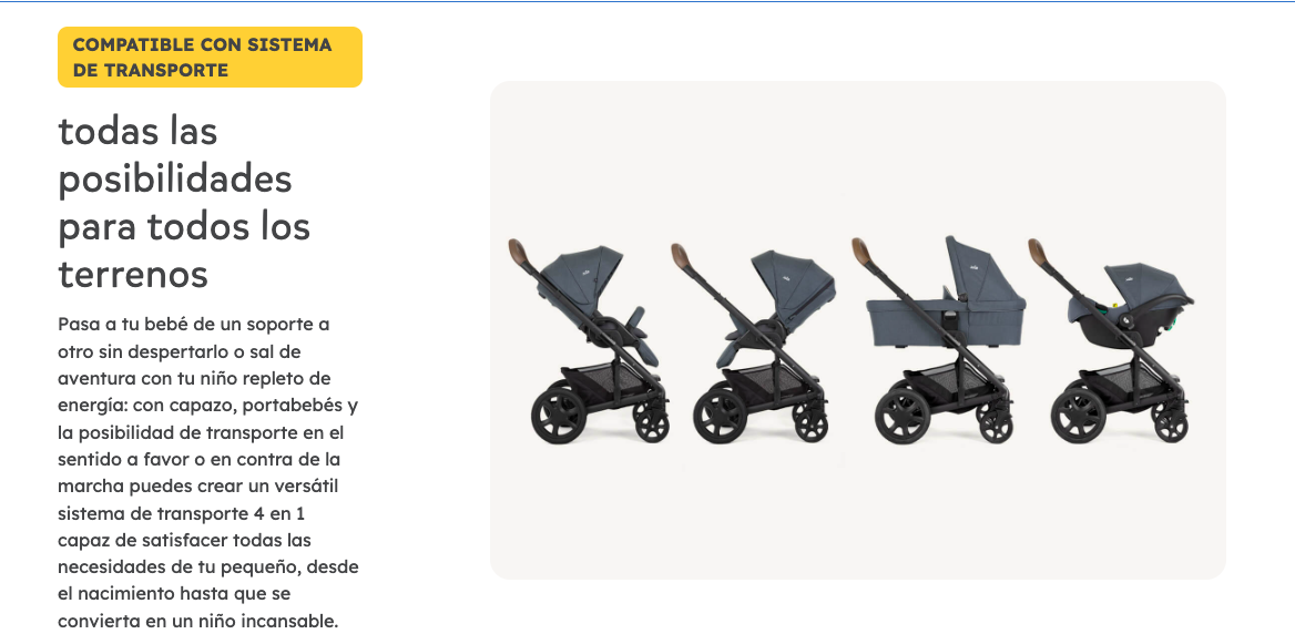 - Cuatro modos de transporte con un solo carrito combinado con el portabebés o el capazo: podrás ir de paseo con tu pequeño desde el primer día y pasarlo del coche al carrito sin sacarlo del asiento ni despertarlo