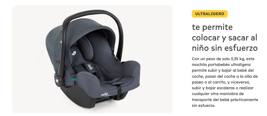 - Peso ultraligero de 3,35 kg, para meter y sacar al bebé sin esfuerzo