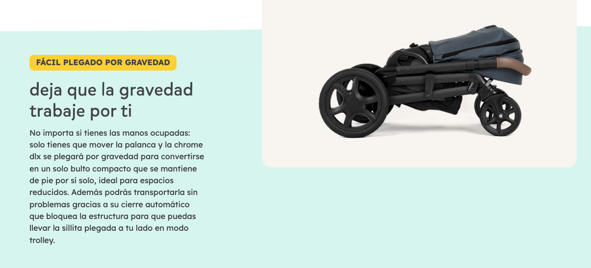 - Deja que la gravedad trabaje por ti: esta sillita se pliega sin esfuerzo para adoptar una forma que se mantiene de pie por sí sola y ocupa un espacio mínimo